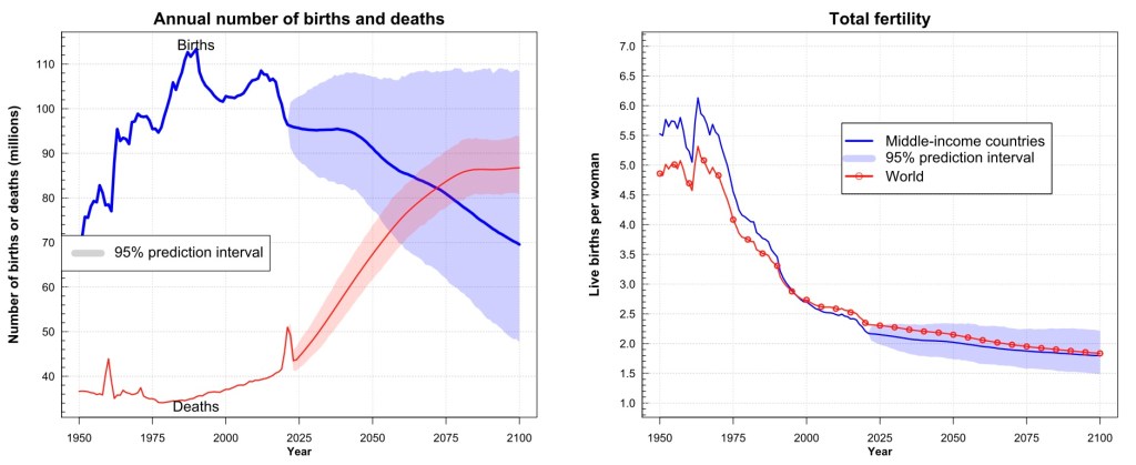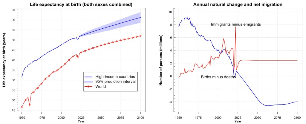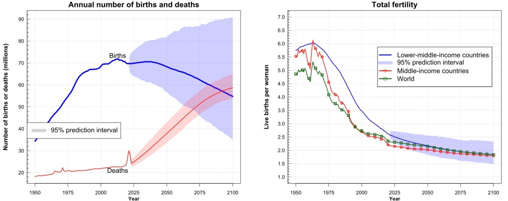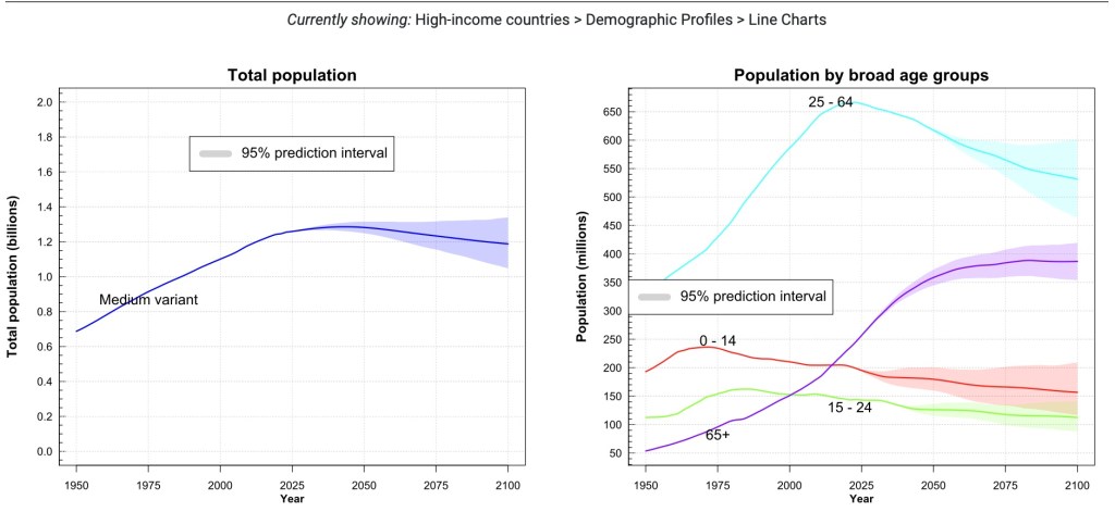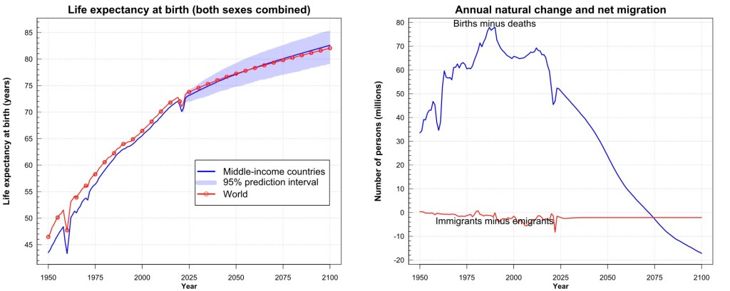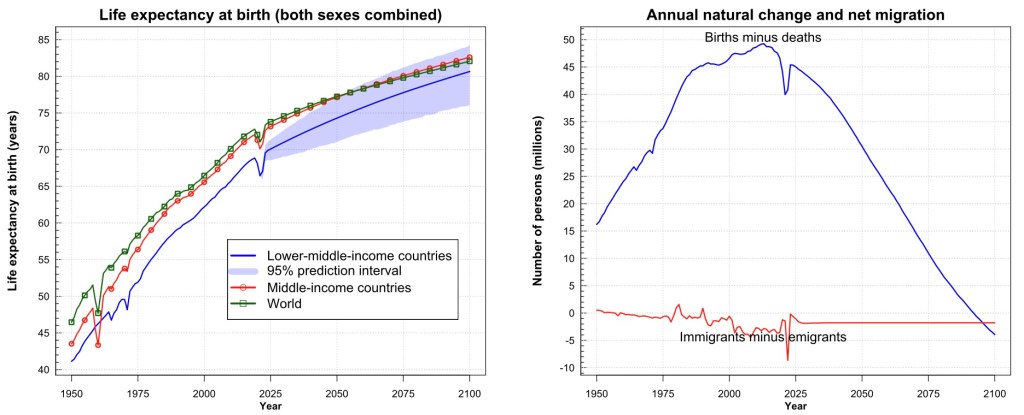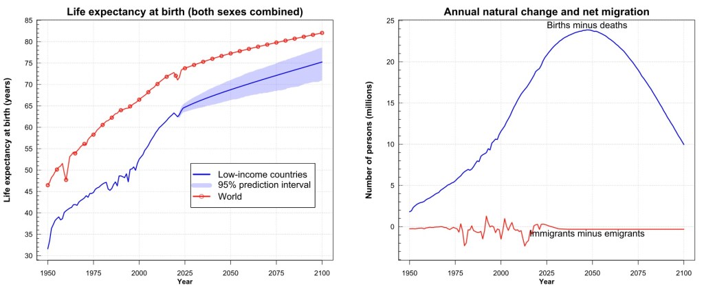 For all five income categories considered, an increase in life expectancy between 9-11 years is estimated by 2100. The estimate for the change in the number of inhabitants is +175% for the low-income category, +42% for the middle-low income category, +15% for the middle income, -28% for upper-medium-income -24% for the high income.