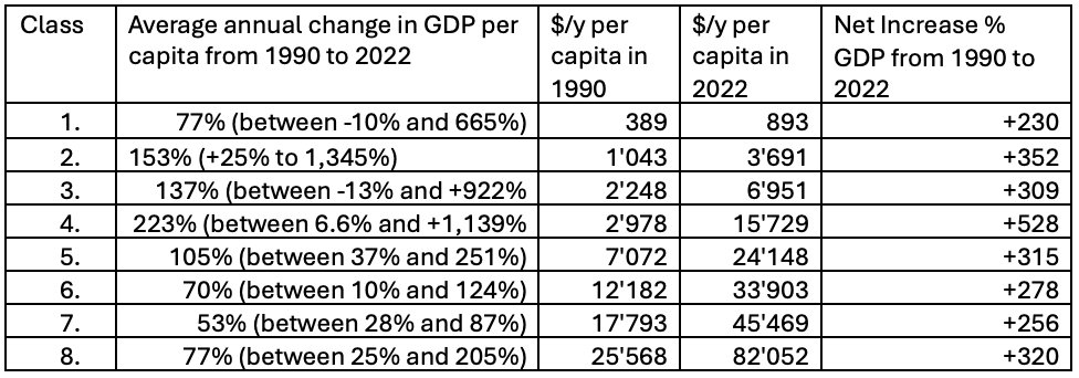 “Imagine a world with about 200 nations, each one unique. Each year, international organizations such as the World Bank collect and analyze data on these nations, helping to paint a picture of how things are changing over time. Recently, we looked at GDP (Gross Domestic Product) per capita data for 1990 and 2022, and divided them into eight categories. This allowed us to see how wealth moved between nations over the course of three decades. Surprisingly, in terms of the number of nations by income bracket, things have remained fairly stable. However, when you look at the data more closely, some significant changes emerge. The average annual growth in GDP per capita for each category showed an increase, as did the net increase in GDP from 1990 to 2022. But what is truly staggering is the huge wealth gap between the richest and poorest nations. This gap is reflected in key aspects of daily life such as access to water, energy, housing, food, education and healthcare. In wealthier nations, life can be expensive. Water, energy, housing, food, clothing, infrastructure, health and social services, and much more, all come at a price. At the same time, these nations face the challenge of growing public debts. On the other side of the coin, poorer nations have limited access to basic services, with a low life expectancy. The question we should all ask ourselves is: how long will it take to find a new balance among the nations of the world? This is a question that humanity has been asking since time immemorial, and the answer is not simple. But one thing is certain: we must continue to work together to promote equity and reduce global disparities.”