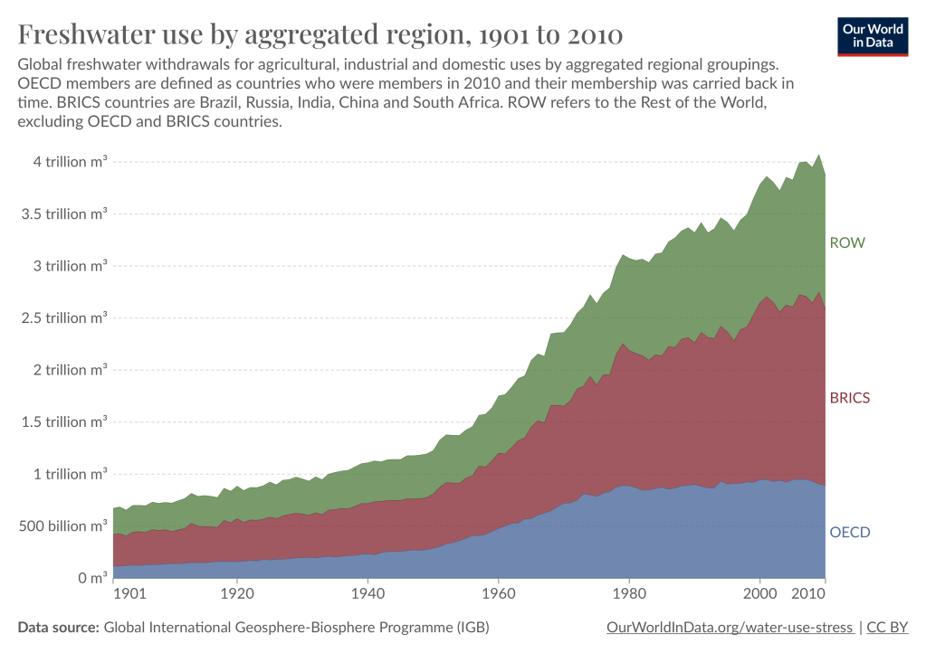La raccolta e l’utilizzo dell’acqua è in costante crescita e dal 1950 in poi la velocità di consumo è raddoppiata rispetto alla prima metà dell’Ottocento.