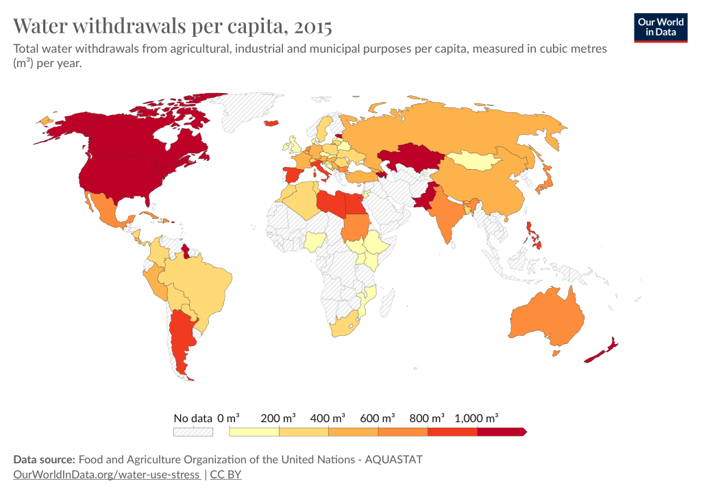 L’uso pro capite nel 2015 è stato particolarmente elevato in Nord America, Kazakistan, Pakistan, seguiti da altri paesi che dipendono in gran parte dall’acqua per scopi agricoli e zootecnici.