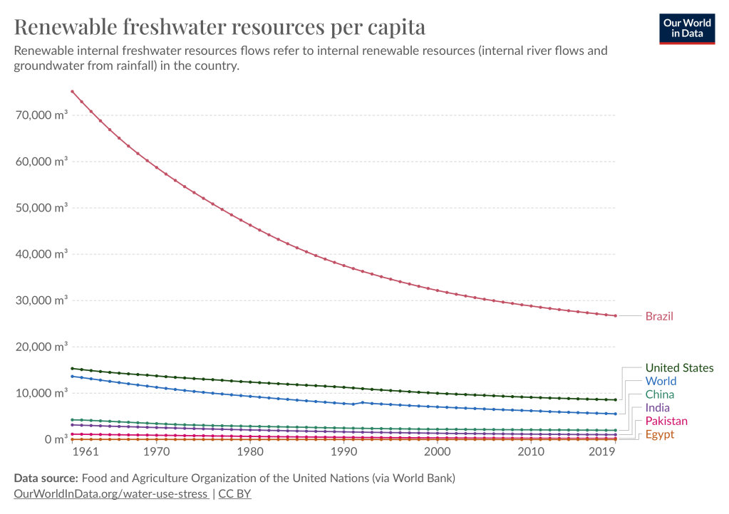 Nei paesi in cui il prelievo di acqua supera il flusso rinnovabile, la “risorsa idrica” diminuisce. Questa tendenza è anche correlata all’aumento della popolazione mondiale.