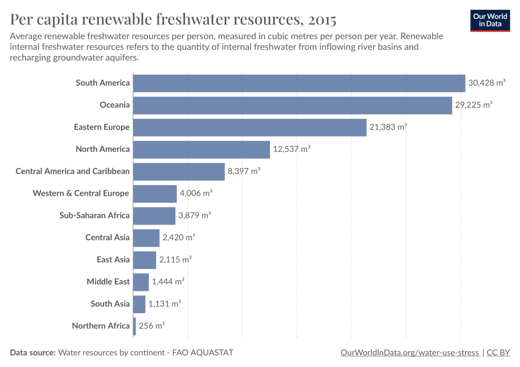 Le risorse idriche, in m3/pro capite, per le nazioni geograficamente aggregate mostrano che dall’Europa centrale e occidentale al Nord Africa diminuisce drasticamente.