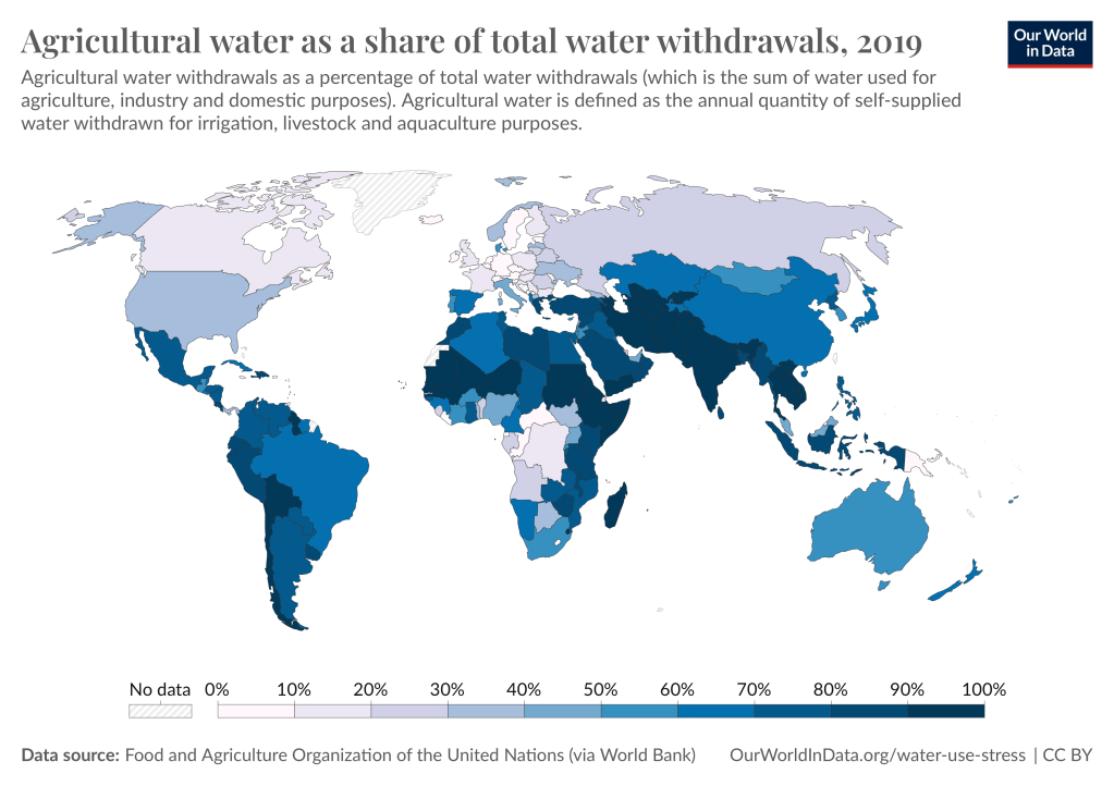 Il consumo per irrigazione delle terre agricole supera il 20% delle risorse in Grecia, Italia, Emirati Arabi uniti, Laos, Equador, India (39%), Pakistan (52%), Azerbaijan e Suriname (71%).