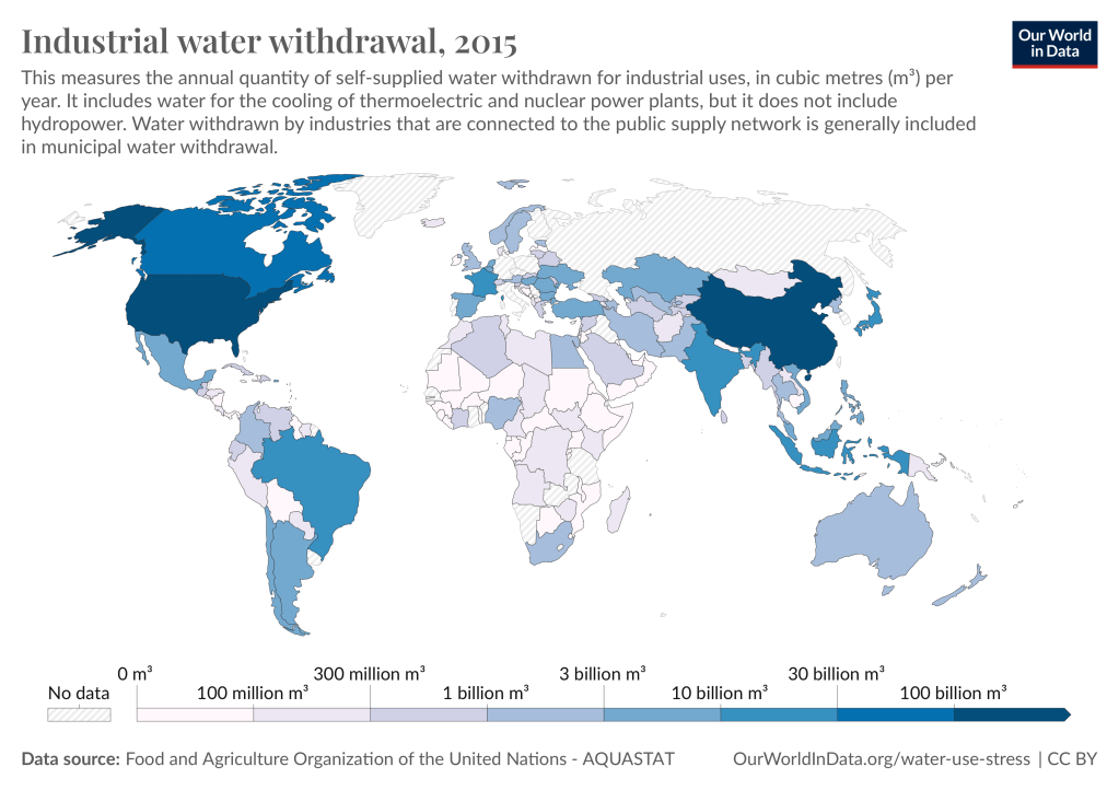 Gli Stati Uniti d’America e la Cina sono i maggiori consumatori di acqua per le attività industriali. L’Africa e il nord-ovest del Sud America hanno Paesi con scarso consumo d’acqua per uso industriale.